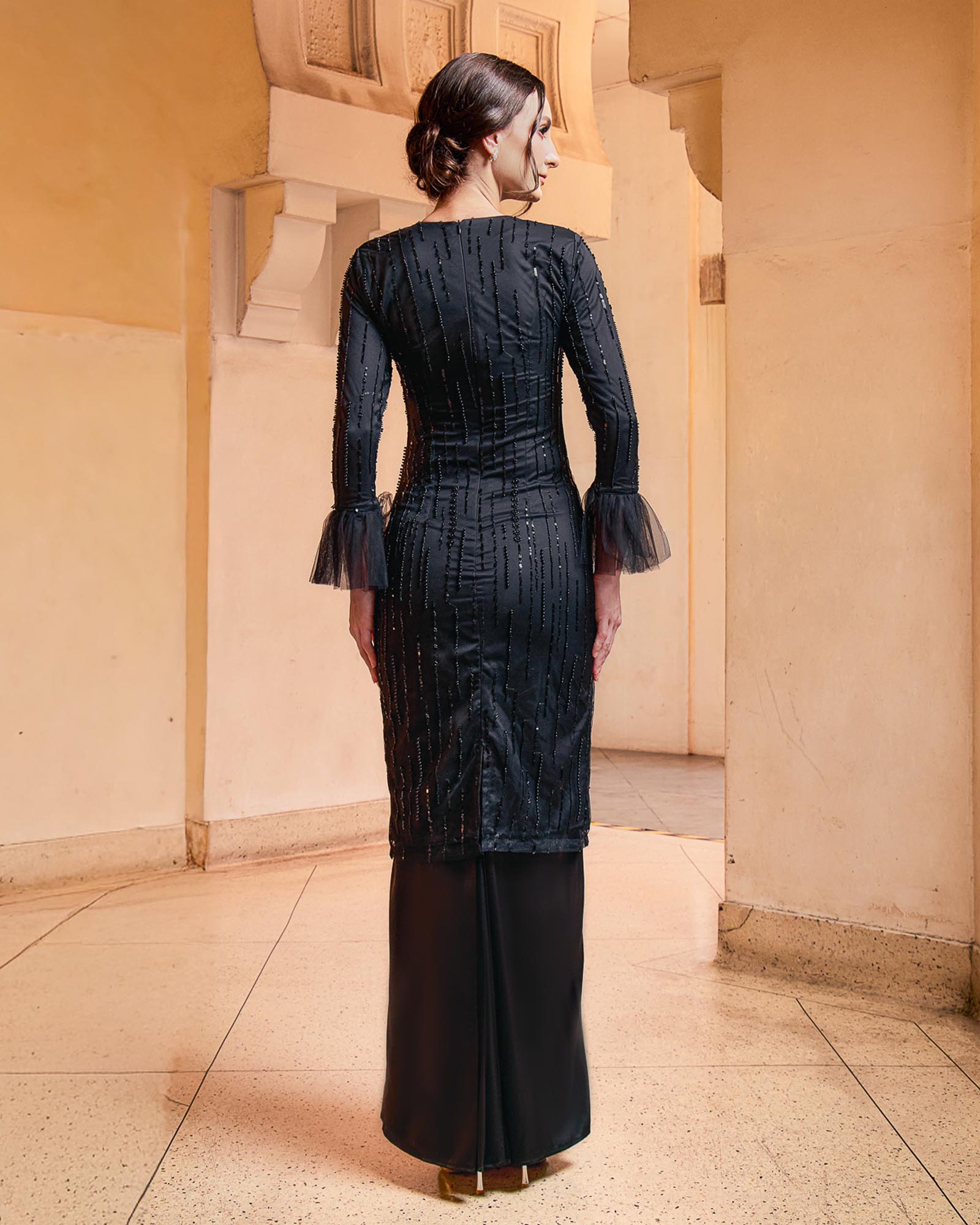 – Fitted sleeves with ruffle cuff